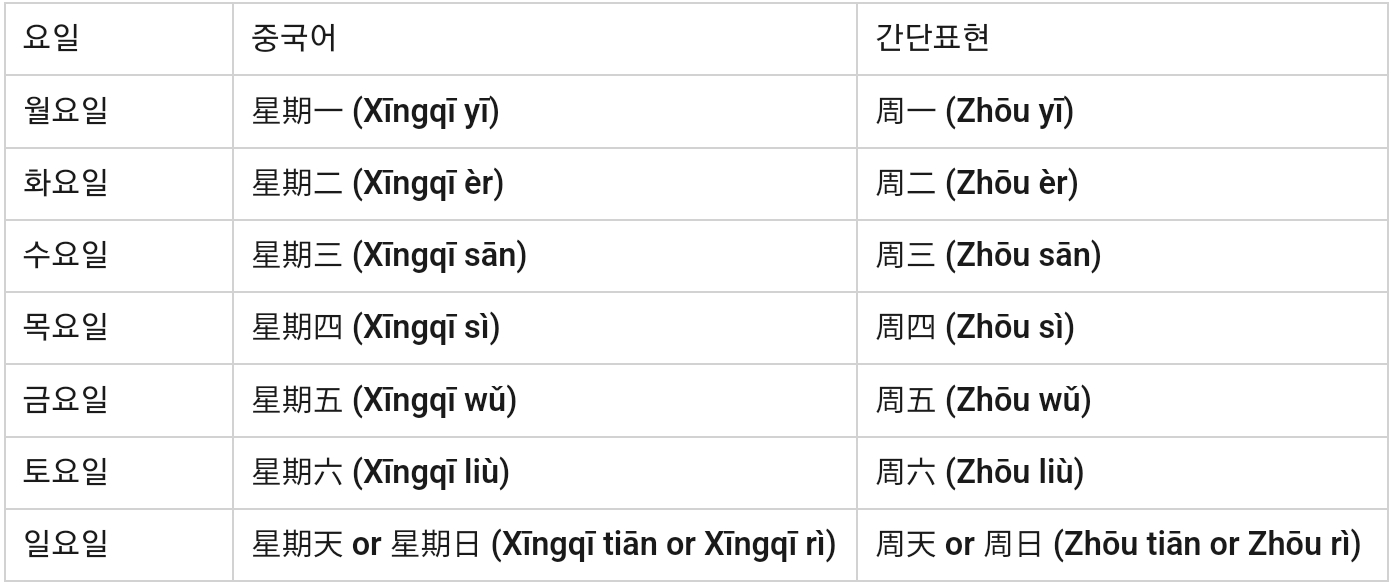 - "星期" (Xīngqī)는 요일을 나타내는 말로, 그 뒤에 오는 숫자나 "天" 또는 "日"을 통해 구체적인 요일을 표현(일요일은 "天"이나 "日" 둘 다 사용). 일반적으로 "星期"를 생략하고 "周" (Zhōu)라는 단어를 사용하여 위와 같이 간단히 표현할 수 있음.